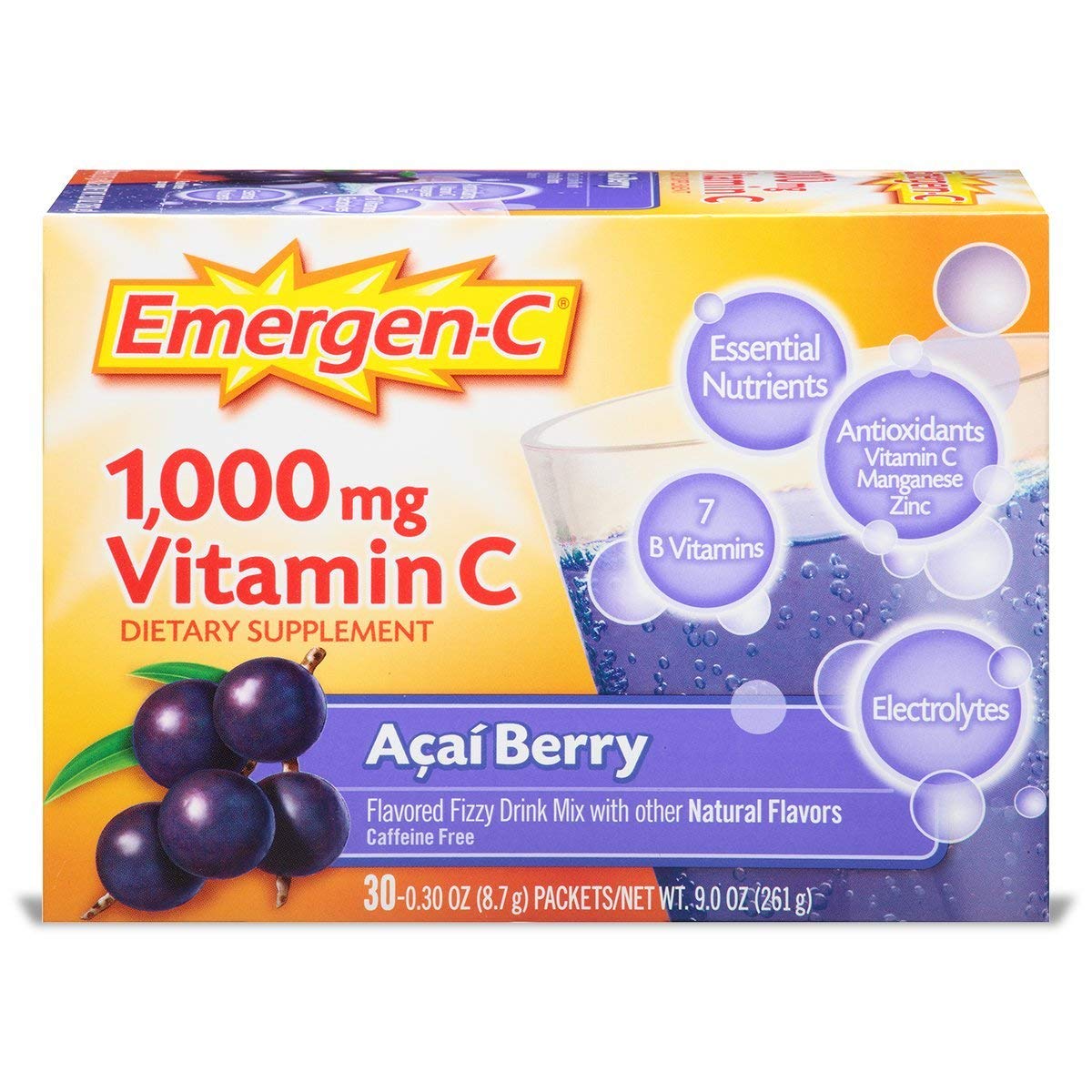 Emergen-C Vitamin C 1000 Mg Acai Berry Flavor 30 Packets-9 Oz